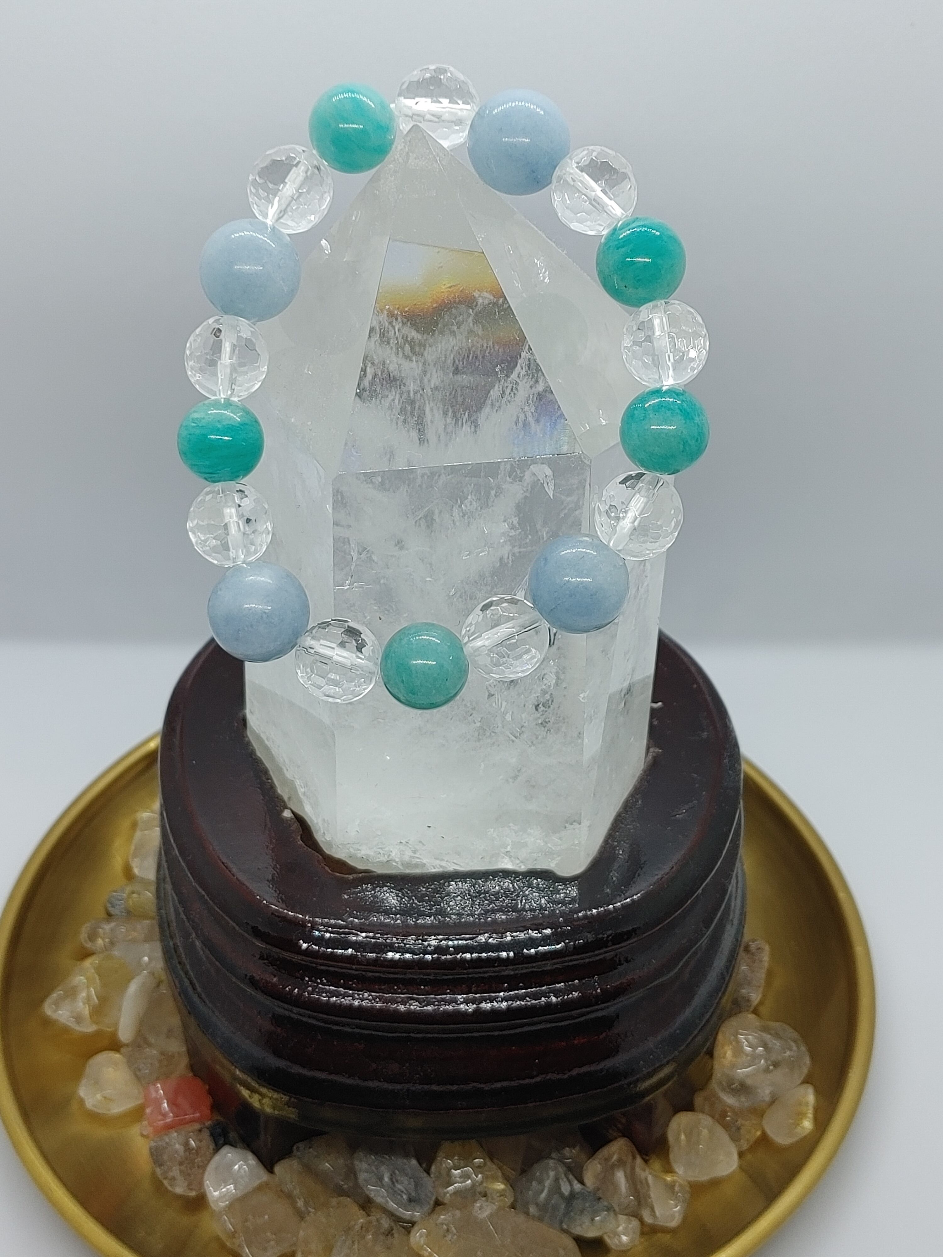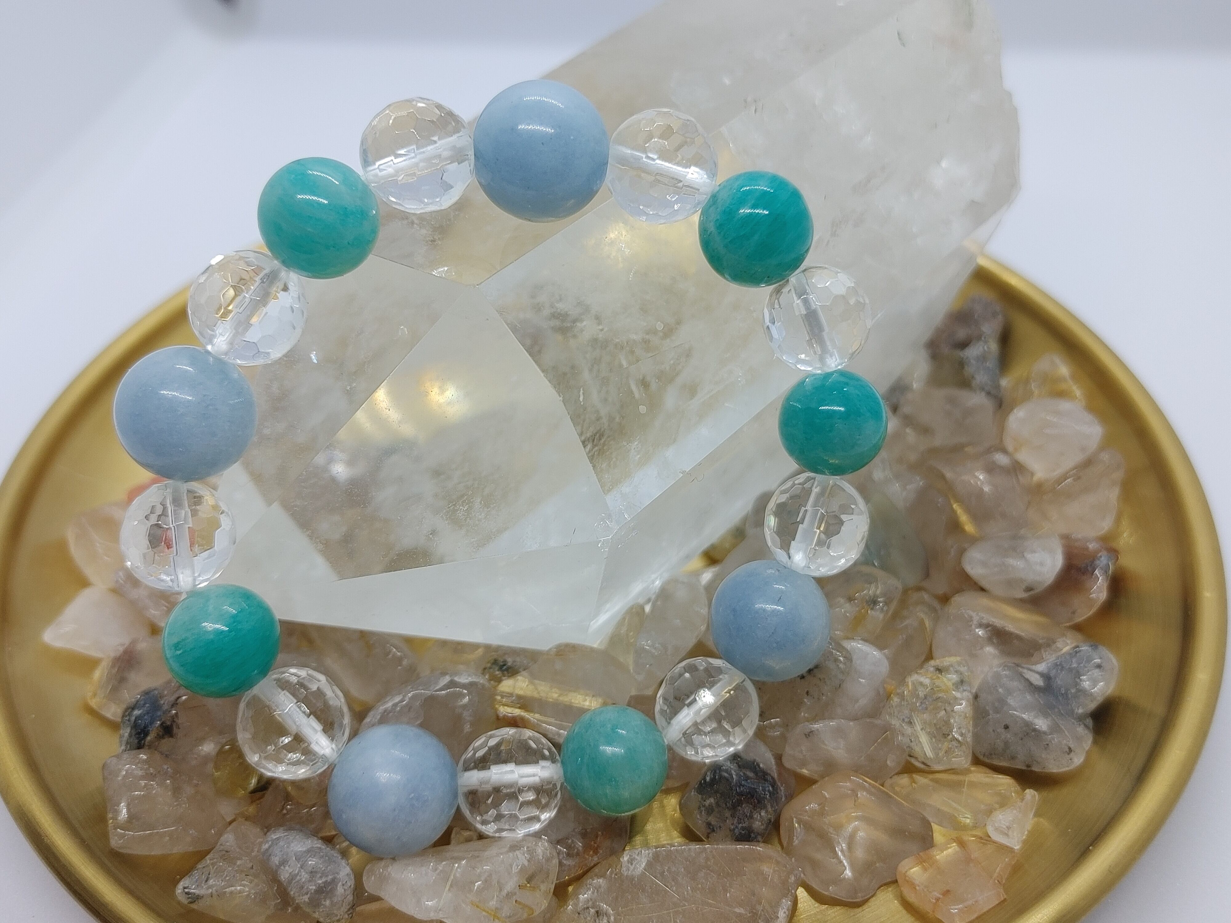 心を癒す力を秘めたラリマー・水晶・アマゾナイトのブレスレットは、優雅なデザインと穏やかなエネルギーを併せ持つアイテムです。ラリマーは心を穏やかにし、ストレスを和らげる効果があると言われ、アマゾナイトは心のバランスを整え、内面的な平和をもたらす力があるとされています。また、水晶は浄化のエネルギーを持ち、持ち主の運気を引き上げるサポートをします。このブレスレットは、日々のストレスを癒し、心の安らぎを与えることでしょう!